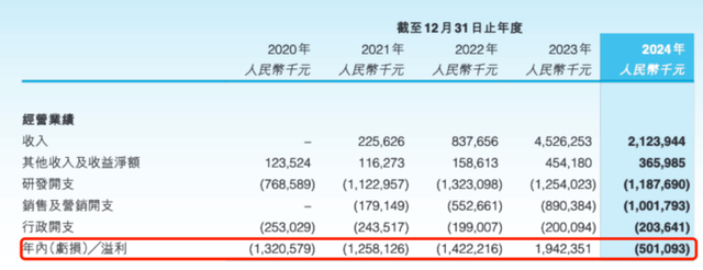 剔除Summit商业合作带来的波动,康方生物的商业销售收入虽然有所增长,不过却难以填补授权收入崩塌留下的巨大财务缺口,企业持续深陷亏损泥潭。2024年财报显示,康方生物净亏损达5.01亿元。回溯过往,除2023年凭借海外授权收入斩获19.42亿元净利润的“高光时刻”外,2020年至2022年的亏损额分别为13.21亿元、12.58亿元、14.22亿元。