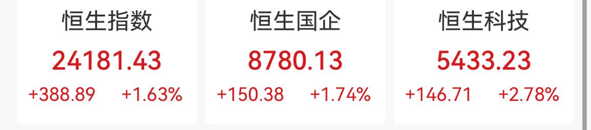 中新经纬6月9日电 9日,港股三大指数集体上涨。截至收盘,恒指涨1.63%,恒生国企指数涨1.74%,恒生科技指数涨2.78%。