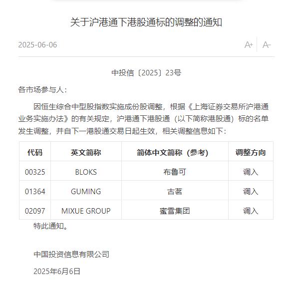 布鲁可涨22.34%,报193.30港元。消息面上,沪深交易所发布公告称,因恒生综合中型股指数实施成份股调整,根据有关规定,港股通标的证券名单发生调整,布鲁可(00325.HK)、古茗(01364.HK)、蜜雪集团(02097.HK)被调入,自6月9日起生效。