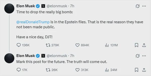 在一次评论中,马斯克提到了已故的恋童癖者杰弗里·爱泼斯坦与特朗普的关系,作为更大规模抨击的一部分。