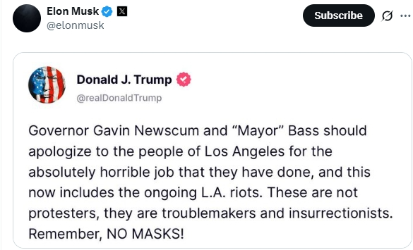 “加文·纽森州长和‘市长’巴斯应该向洛杉矶人民道歉,因为他们做得非常糟糕,这现在包括正在进行的洛杉矶骚乱,”特朗普周日晚在马斯克分享的帖子中说。“这些人不是抗议者,而是滋事者和叛乱分子。”