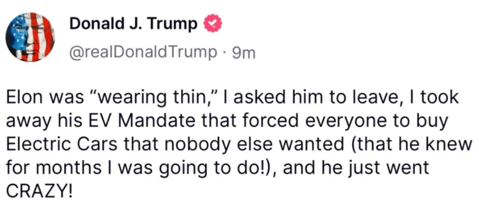 “伊隆已经‘不堪重负’,我让他离开,我取消了他的电动汽车强制令,该令迫使所有人购买没人想要的电动汽车(他几个月前就知道我会这么做!),他因此发疯了!”特朗普在一篇帖子中写道。