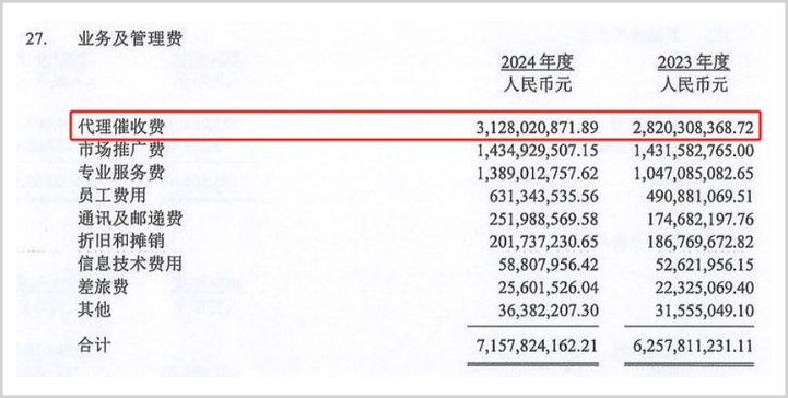 公司公告显示,2020年至2024年其代理催收费用连创新高,分别达到11.56亿元、15.01亿元、20.88亿元、28.20亿元,31.3亿元,五年合计高达107亿元。