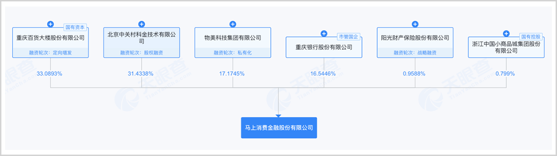 目前,马上消金的持股比例为,重庆百货持股31.06%、中关村科金技术持股29.5%、物美持股16.12%、重庆银行持股15.53%。