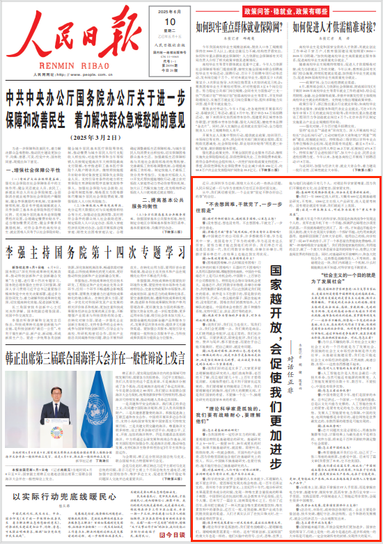 在头版用了近三分之一的篇幅采访了华为创始人任正非,文章的标题是“国家越开放,会促使我们更加进步”。