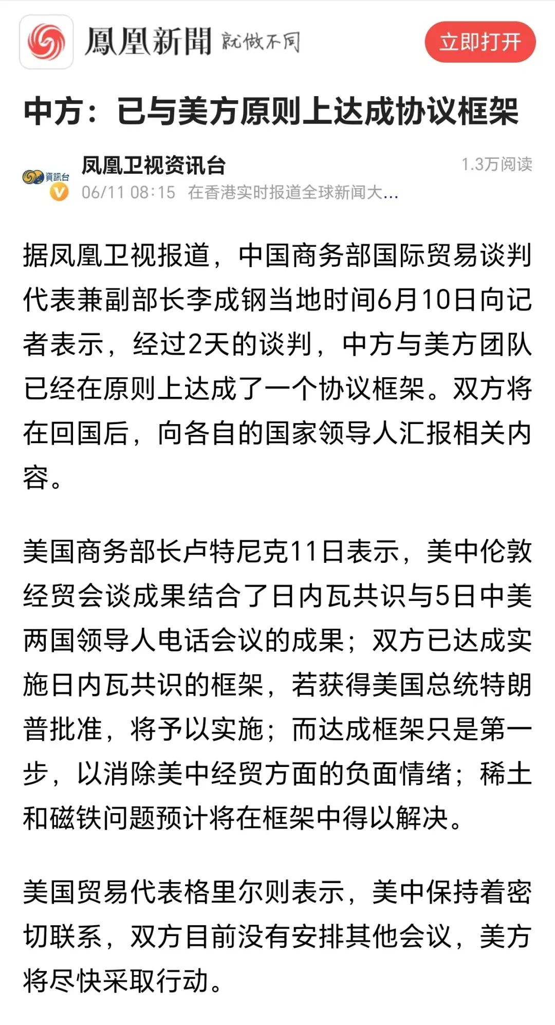 达成框架只是第一步,以消除美中经贸方面的负面情绪;稀土和磁铁问题预计将在框架中得以解决。