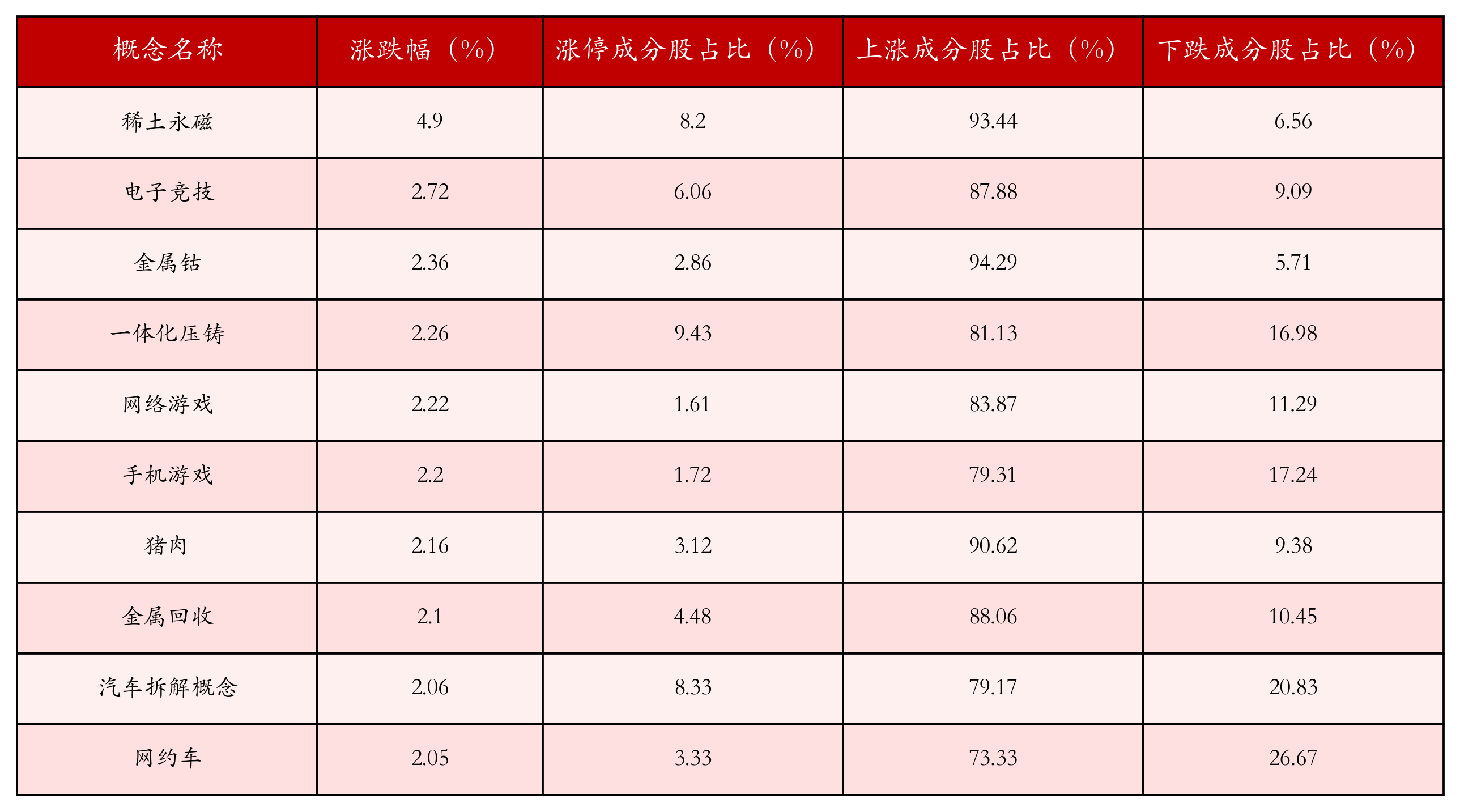 根据A股概念涨跌幅与所对应的股票池综合分析,涨幅靠前的三个概念板块分别为:稀土永磁、电子竞技与金属钴。排名前10位的概念板块相关数据见下表: