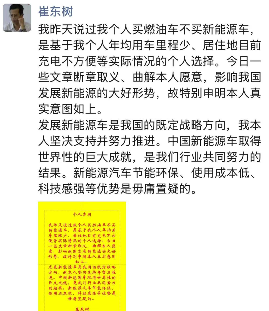 “我昨天说过我个人买燃油车不买新能源车,是基于我个人年均用车里程少、居住地目前充电不方便等实际情况的个人选择。一些文章断章取义、曲解本人原意,影响我国发展新能源的大好形势,故特别申明本人真实意图如上。”