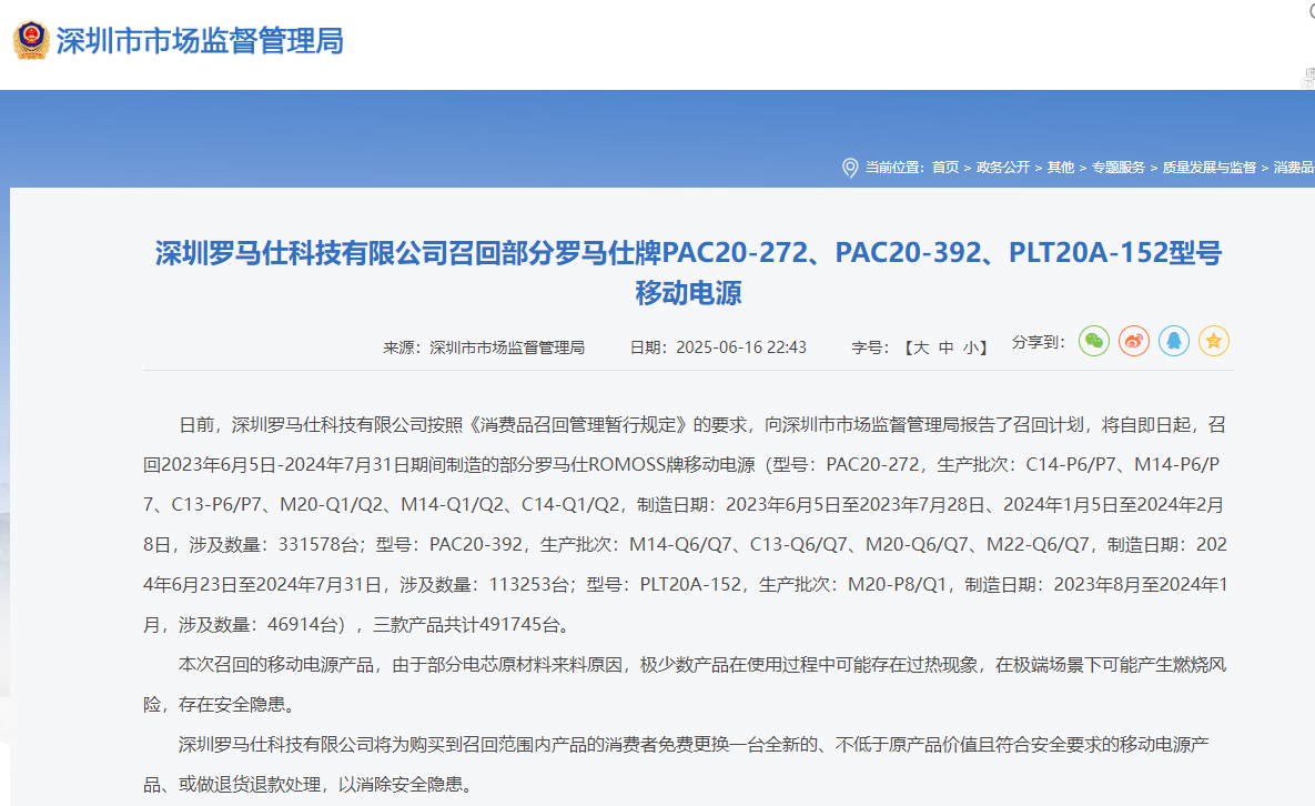据深圳市市场监督管理局,日前,深圳罗马仕科技有限公司按照《消费品召回管理暂行规定》的要求,向深圳市市场监督管理局报告了召回计划,将自即日起,召回2023年6月5日-2024年7月31日期间制造的部分罗马仕ROMOSS牌移动电源,涉及PAC20-272、PAC20-392、PLT20A-152型号,三款产品共计491745台。