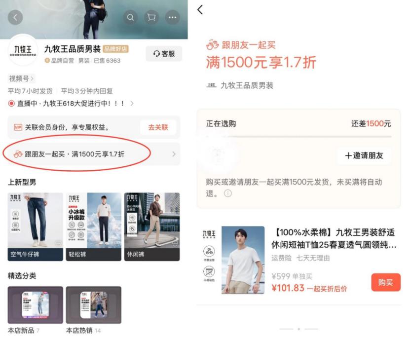 近日,九牧王作为第一批参与“一起买”内测的企业,其分享了这一新功能。用户进入微信小店后,在首页即可看到“跟朋友一起买”的提示。进入拼单页面后,用户可以直接选择任一商品进行下单,也可以将拼团链接分享给微信好友或社群。