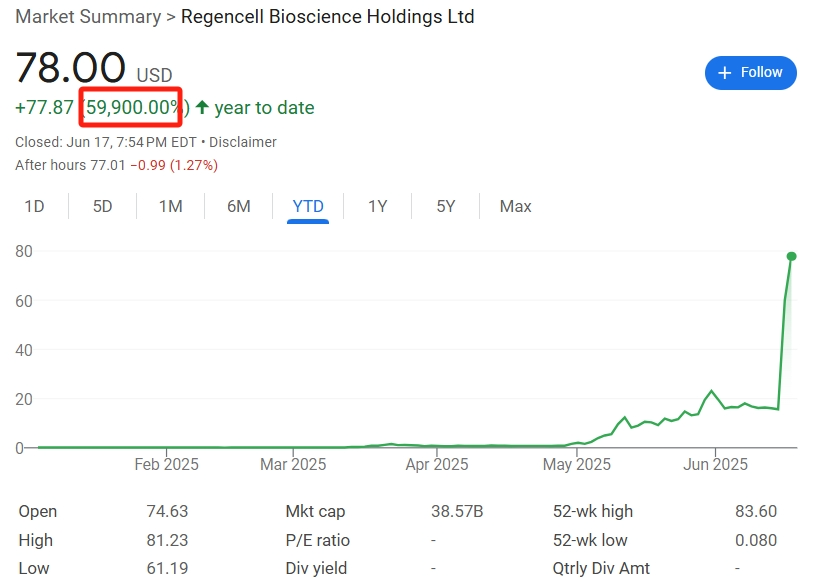 脑再生科技有限公司(Regencell Bioscience,纳斯达克代码:RGC)近日股价暴涨,周一收盘价较6月2日上涨超过280%。