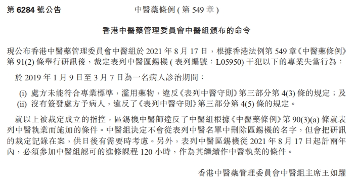 根据一份公开文件,2021年8月,区锡机因滥开药物被香港中医药管理委员会中医组认定为职业失当。
