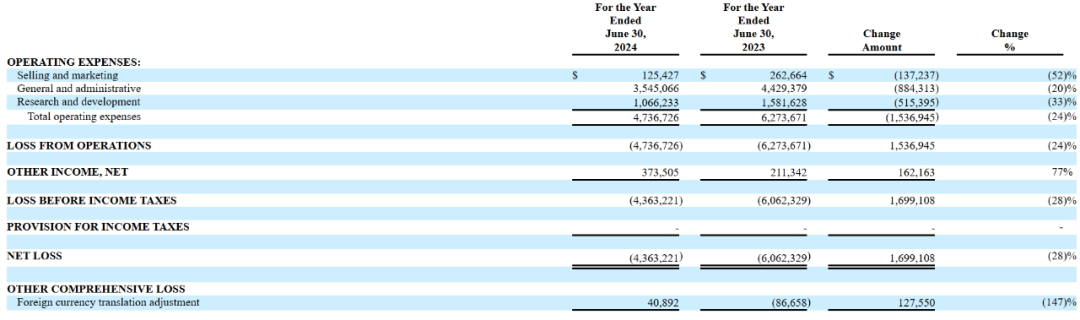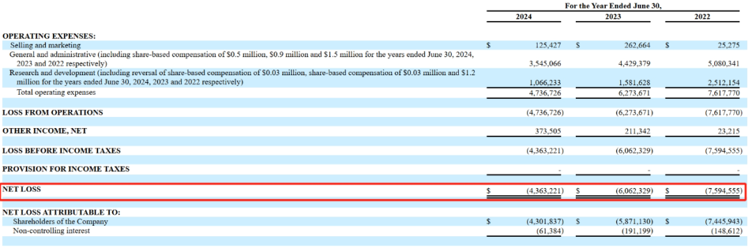 这一最新年报文件显示,在截至2024年6月和2023年6月的财政年度,脑再生分别录得净亏损436万美元和606万美元。