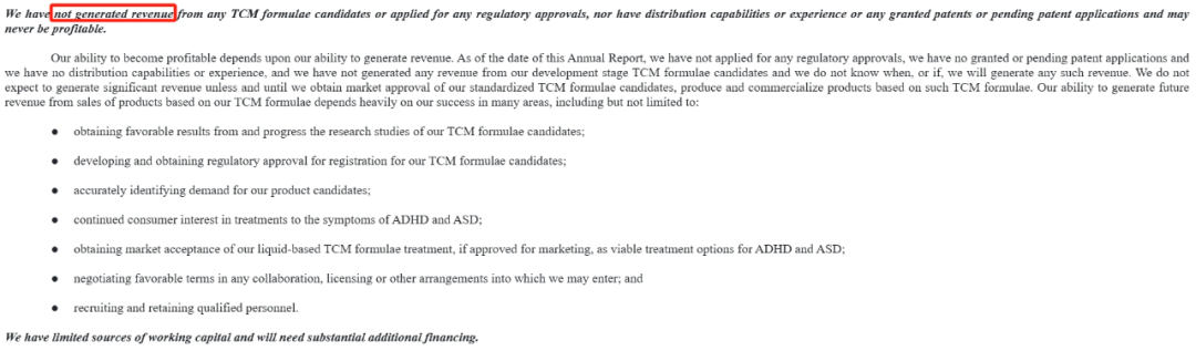 据脑再生去年10月提交给美国证券交易委员会的文件,公司目前仍未实现收入,也未就其中药配方提交任何监管审批。