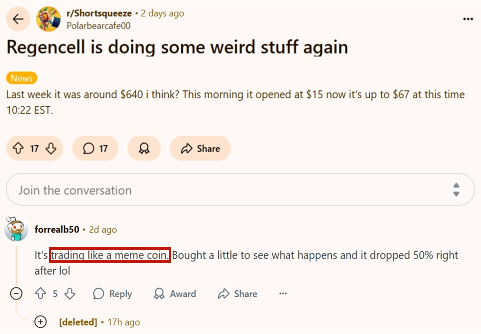 有分析称,脑再生的暴涨行情被视为投机驱动,有Reddit用户称它“交易得像个迷因币”。