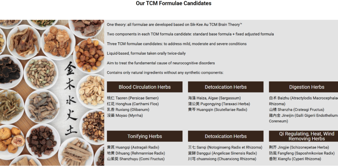 脑再生官网介绍称,旗下三种口服液体制剂的中药配方候选药物可针对轻度、中度和重度病情,且仅含天然成分,如所谓的“解毒草药”、促进血液循环的草药和助消化的草药。