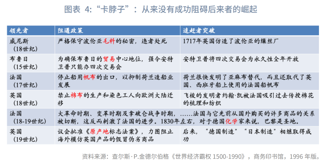 “卡脖子”从未真正阻挡过后来者的崛起。威尼斯曾试图以死刑威胁阻止羊毛纺织技术外泄,但最终英国仍在18世纪成功仿造了技术。布鲁日曾设法限制安特卫普的交易次数以维持自身地位,但安特卫普通过制度创新迅速取而代之。法国在被禁运帆布出口后转向亚麻替代,很快取得突破,甚至反过来抢占原本属于英国和西班牙的市场份额。英国自身也曾通过禁止技术和人才外流来维持领先,例如限制纺织机出口、禁止工人迁移,但法国依然成功挖走关键技术人员,建立本土棉纺厂。法国大革命和拿破仑战争时期,在面临广泛禁运的情况下,其化学工业反而迎来飞跃,到1830年前后,巴黎已成为欧洲化工中心。进入19世纪,英国试图通过《原产地标志法案》封锁阻止海外模仿,但很快被德国和日本超越。可见,技术封锁的效果往往是短暂的,真正决定竞争力的,是制度、组织和持续创新的能力。