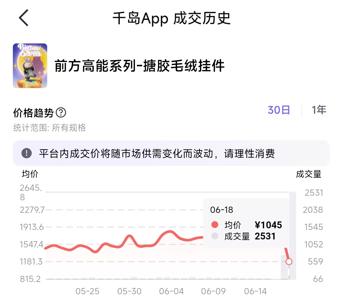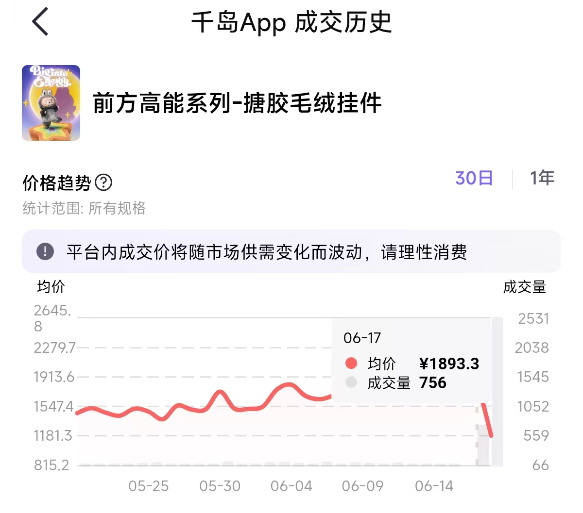 红星资本局发现,在多个二手平台,LABUBU成交量飙升。在闲鱼的行情热点上,“前方高能labubu3.0盲盒太戳我”话题排名第一,处于“爆”的状态。千岛APP(潮玩二手交易平台)显示,6月18日的成交量是2531件,成交均价为1045元,而一天前的成交量为756件,成交均价高达1893.3元。交易量较前一日暴涨超2倍。