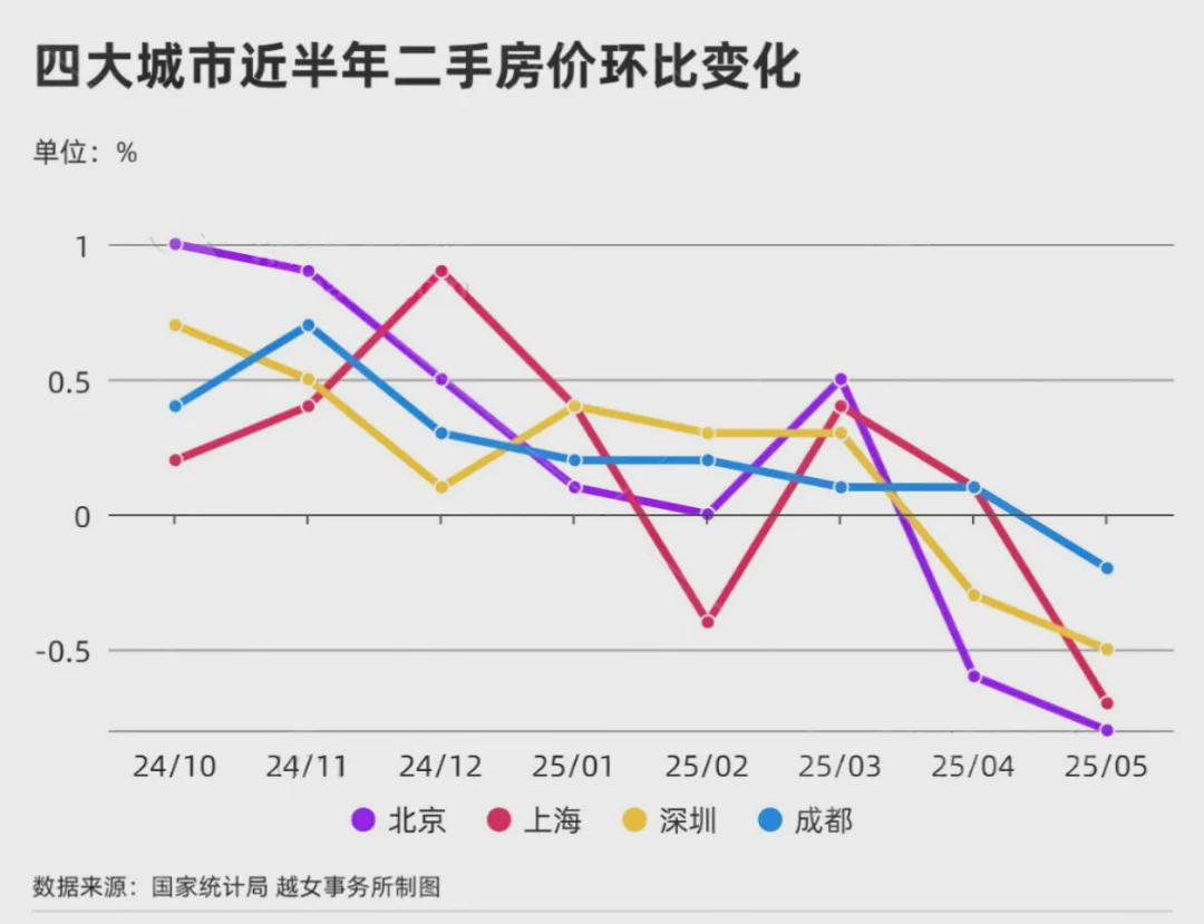 北京、上海、广州和深圳分别是:-0.8%、- 0.7% 、- 0.8% 和- 0.5% 。