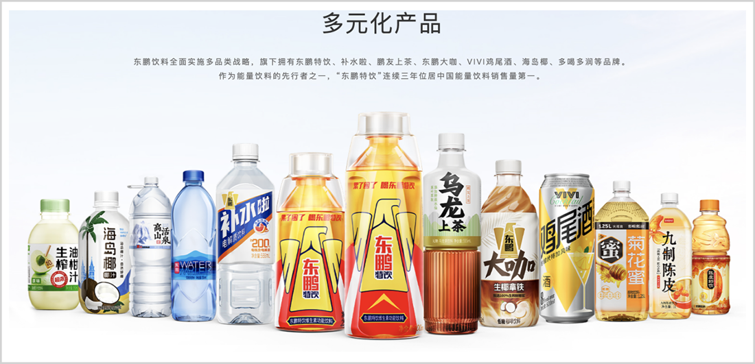 “1+6+N”多品类战略指引下,东鹏饮料旗下拥有东鹏特饮、补水啦、鹏友上茶、东鹏大咖、VIVI鸡尾酒、海岛椰、多喝多润等品牌,逐步从单一品类向多元品类的综合饮料集团进发。