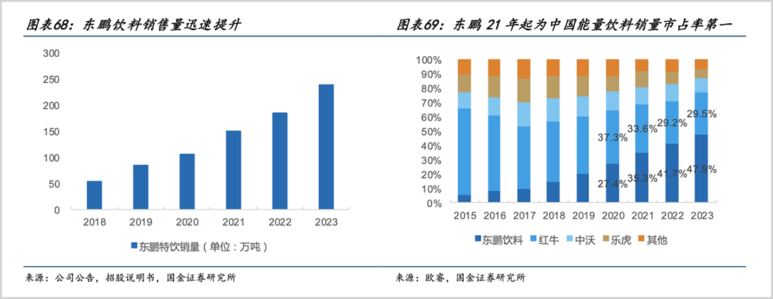 根据尼尔森IQ数据,2024年东鹏特饮在我国能量饮料市场销售量占比由2023年的43%进一步提升到47.9%,几乎占据半壁江山,连续四年销量最高,持续给红牛上强度。
