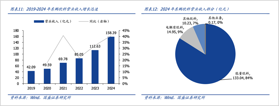 2021年,东鹏特饮一举登上中国能量饮料冠军宝座。2023年,收入达到103亿元,晋级为百亿大单品。截至2024年,东鹏特饮已经连续三年斩获中国能量饮料第一名,2024年营收133亿元,同比增长28.49%。
