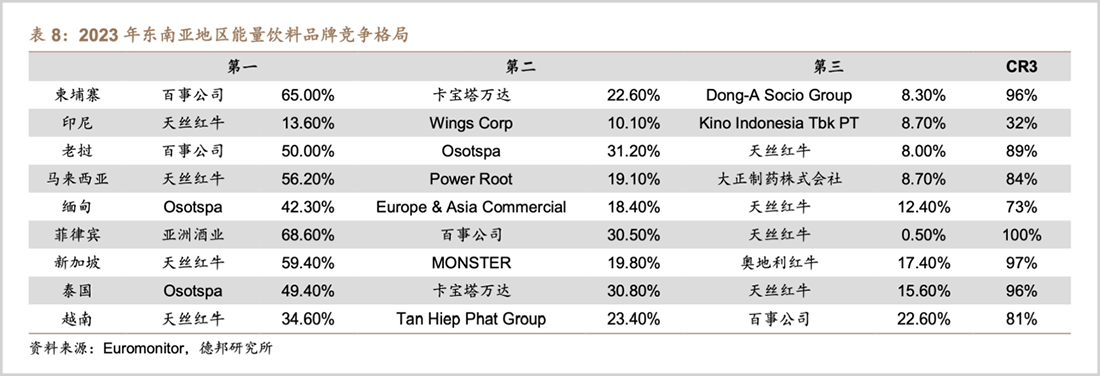 在出海第一站的选择上,东鹏饮料做过详细的背景调查。总体来看,天丝红牛、魔爪和卡拉宝等国际巨头在东南亚占据了主导地位,但只有印尼CR3市占率仅32%,其他国家均超过70%。进军印尼,难度显然要小一些。