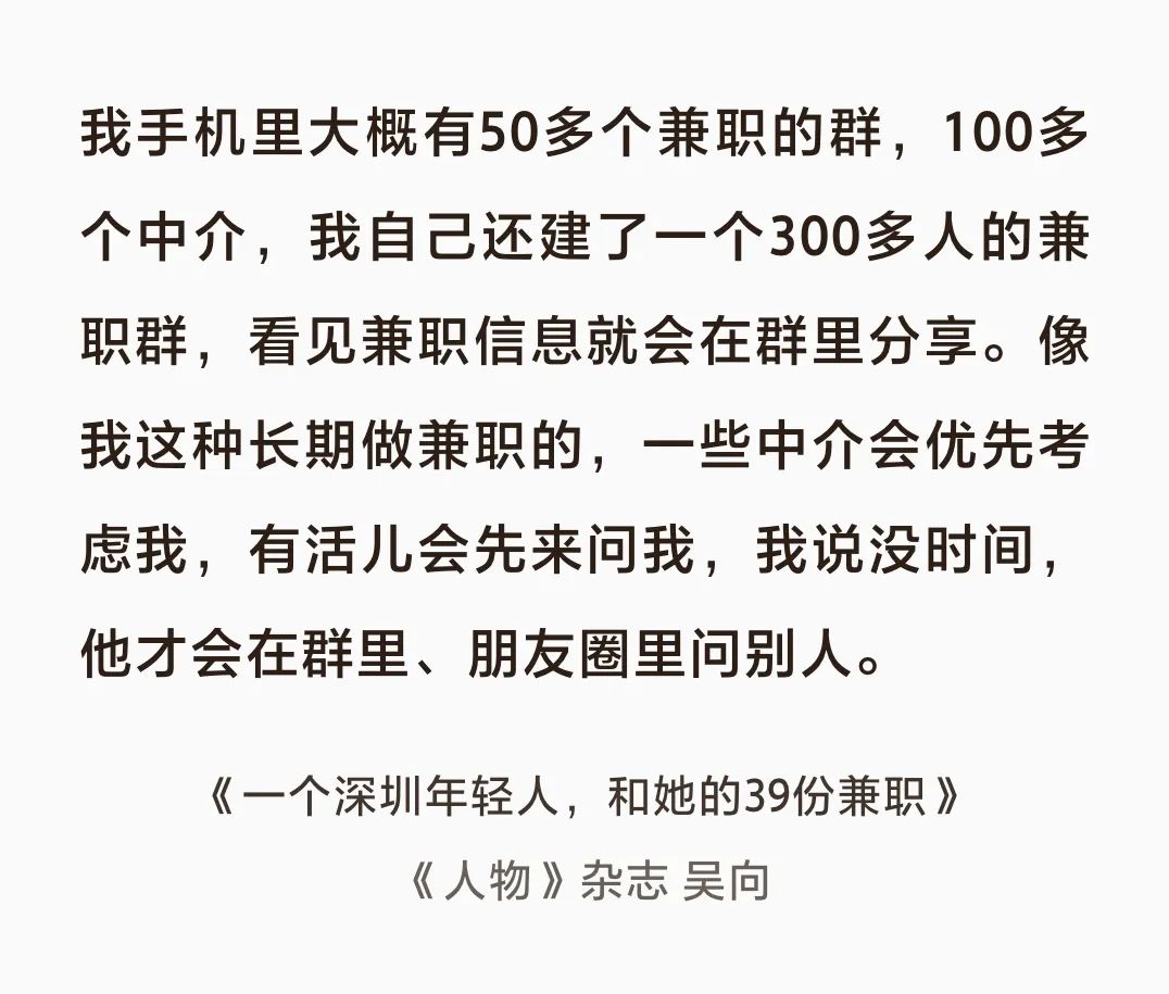 加了50多个兼职的群,100多个中介,自己还建了一个300多人的兼职群。 长期做兼职的人,也更容易找到活。