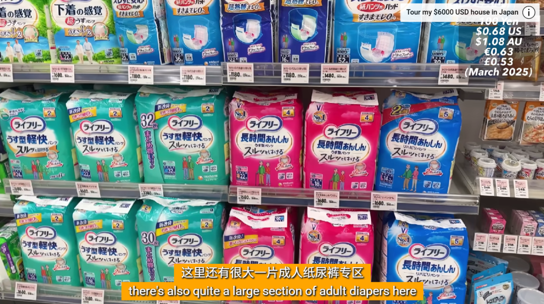 超市的一个货架上,摆满了各种成人纸尿裤。