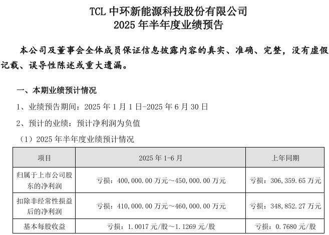 9日晚,TCL中环发布业绩预告,预计上半年归母净亏损40亿元至45亿元,上年同期为净亏损约30.64亿元,亏损同比扩大。