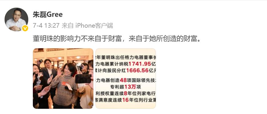 7月4日,微博认证为“格力电器市场总监”的朱磊发微博称,“董明珠的影响力不来自于财富,来自于她所创造的财富。”发文配了一张董明珠出席两会时的照片以及董明珠在任格力董事长期间纳税的金额和向股民的分红以及格力的专利数量。