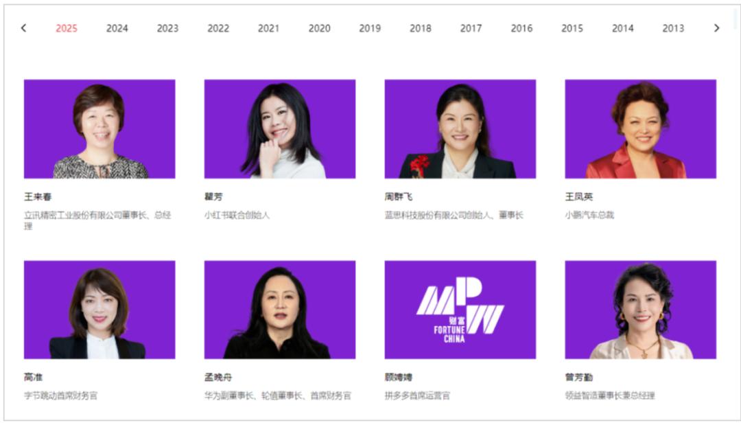 《财富》杂志于近日发布了2025年中国最具影响力的商界女性榜单,立讯精密董事长王来春连续第三年位居榜首,华为副董事长孟女士、小鹏汽车总裁王凤英、字节跳动首席财务官高准、宏胜饮料集团总裁宗馥莉、拼多多首席运营官顾娉娉等入选了该榜单,今年榜单最大的意外就是格力董事长董明珠15年来首次落榜。