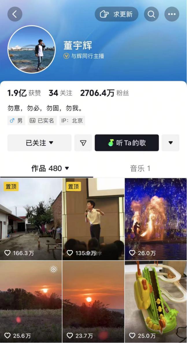 对于与辉同行来说,董宇辉主打文化人设,但是与辉同行账号却定位于直播带货,并非一个纯粹的优质内容账号。对比而言,俞敏洪的抖音账号在2024年12月入选抖音月度精选作者。