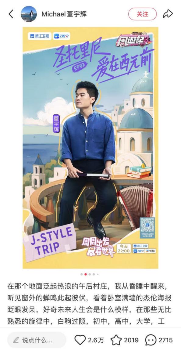 今年4月,董宇辉作为嘉宾参与了周杰伦的综艺《周游记》的录制;6月,董宇辉现身央视暑期视听嘉年华的直播现场,官宣将以主持人身份参与综艺《山海寻味》的录制。