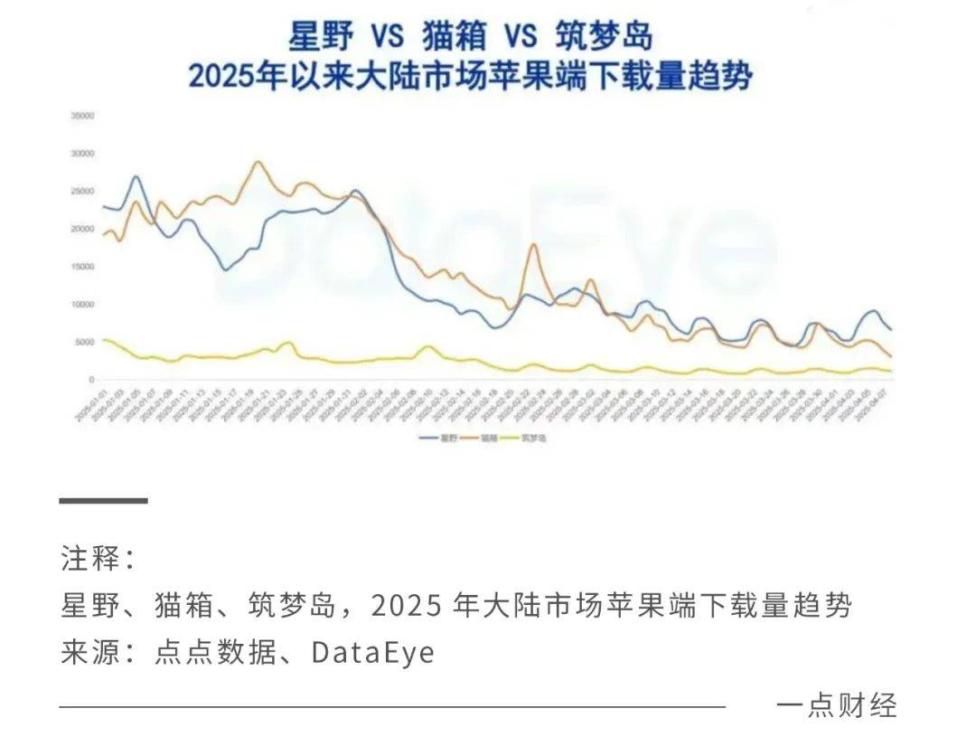 DataEye的数据异常冰冷:2025年国内社交AI下载量整体滑坡,星野成了最惨注脚——今年2月之前苹果端日下载量约2万次,随后迅速下滑,到了4月仅剩约7000次。