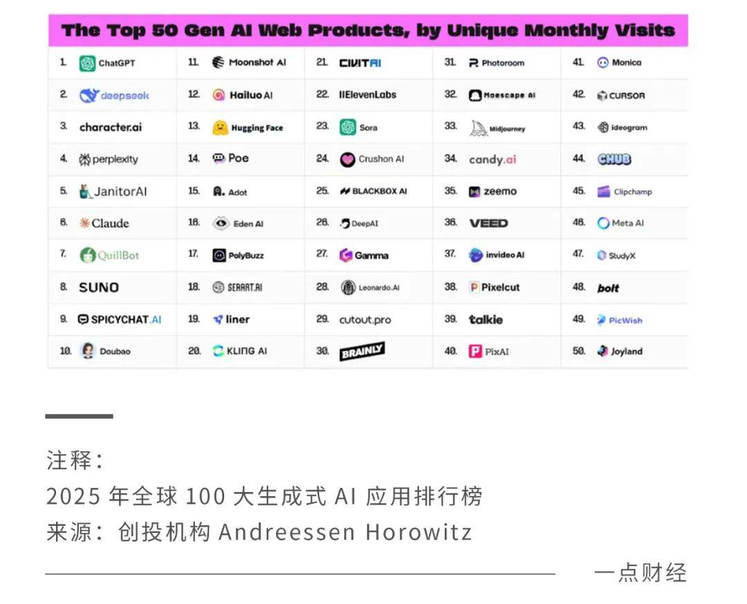 咨询公司Andreessen Horowitz发布的2025年全球100大生成式AI 应用排行榜中,Character .ai排在第三位,仅次于ChatGPT和DeepSeek。