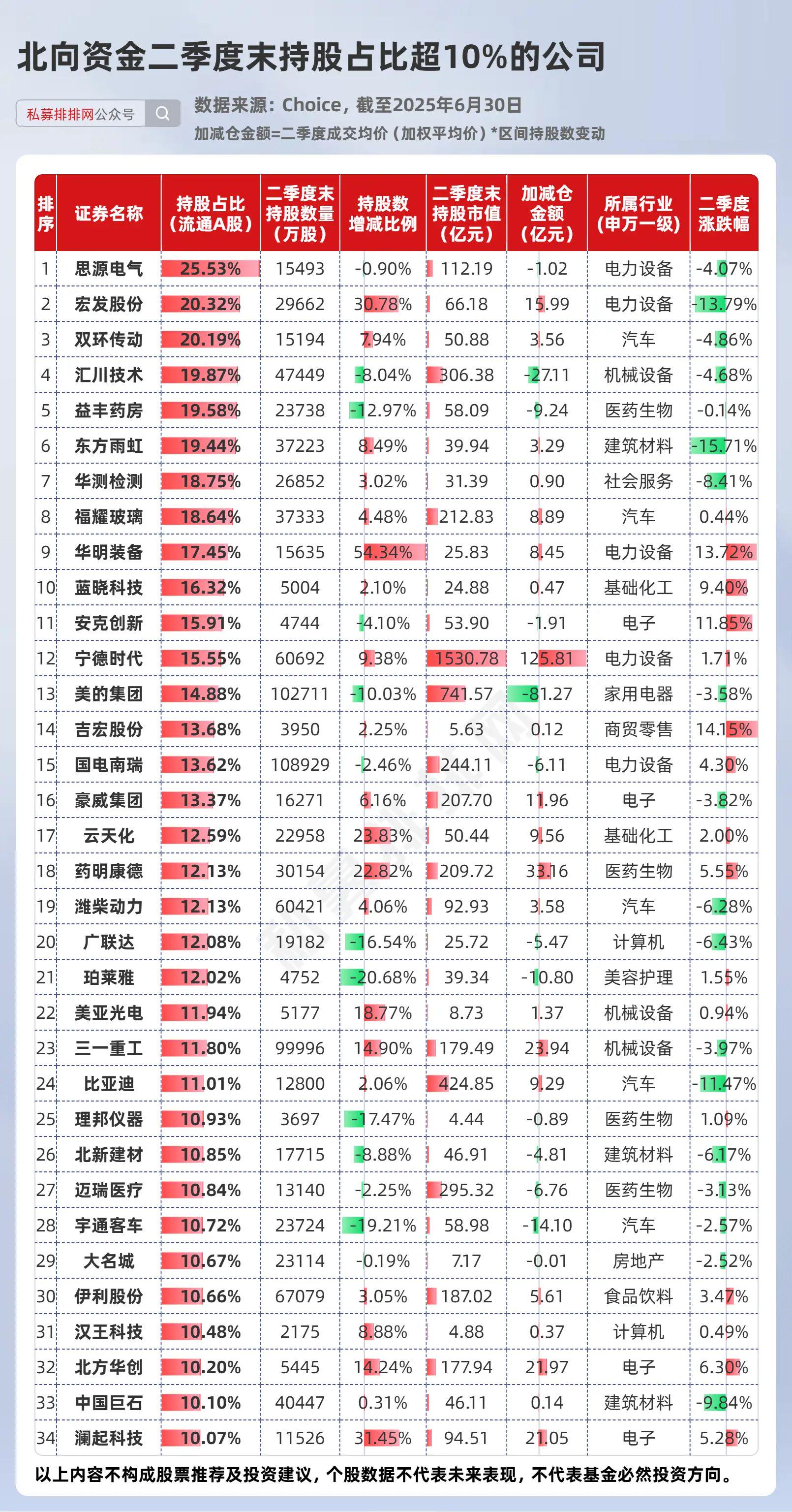从北向资金持股占流通A股的比例来看,2025年二季度末,北向资金持股占比超10%的公司有34家。其中,电力设备、汽车行业各占5家,电子、医药生物行业各占4家。北向资金持股占比超20%的公司有思源电气、宏发股份、双环传动等3家公司。