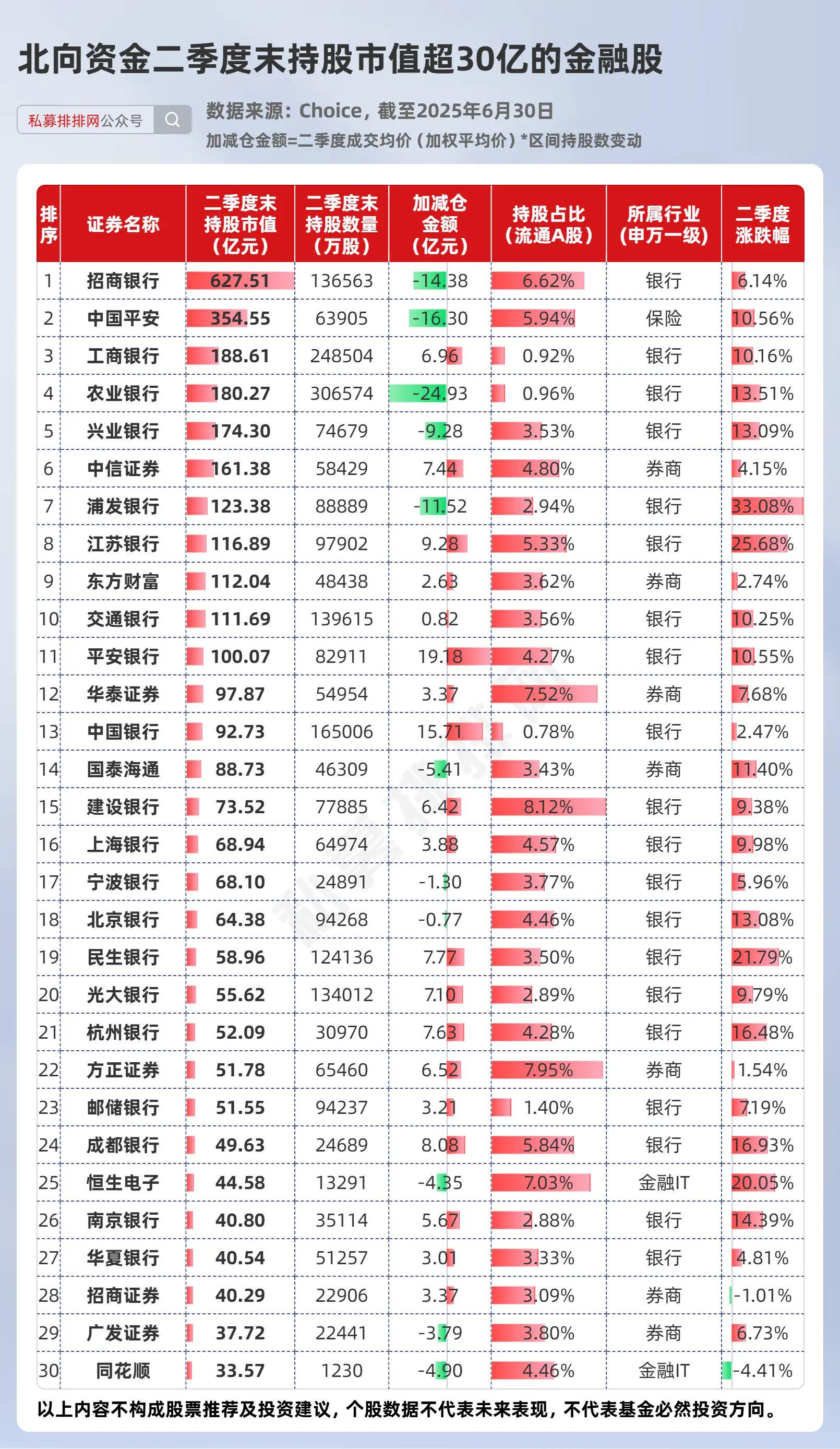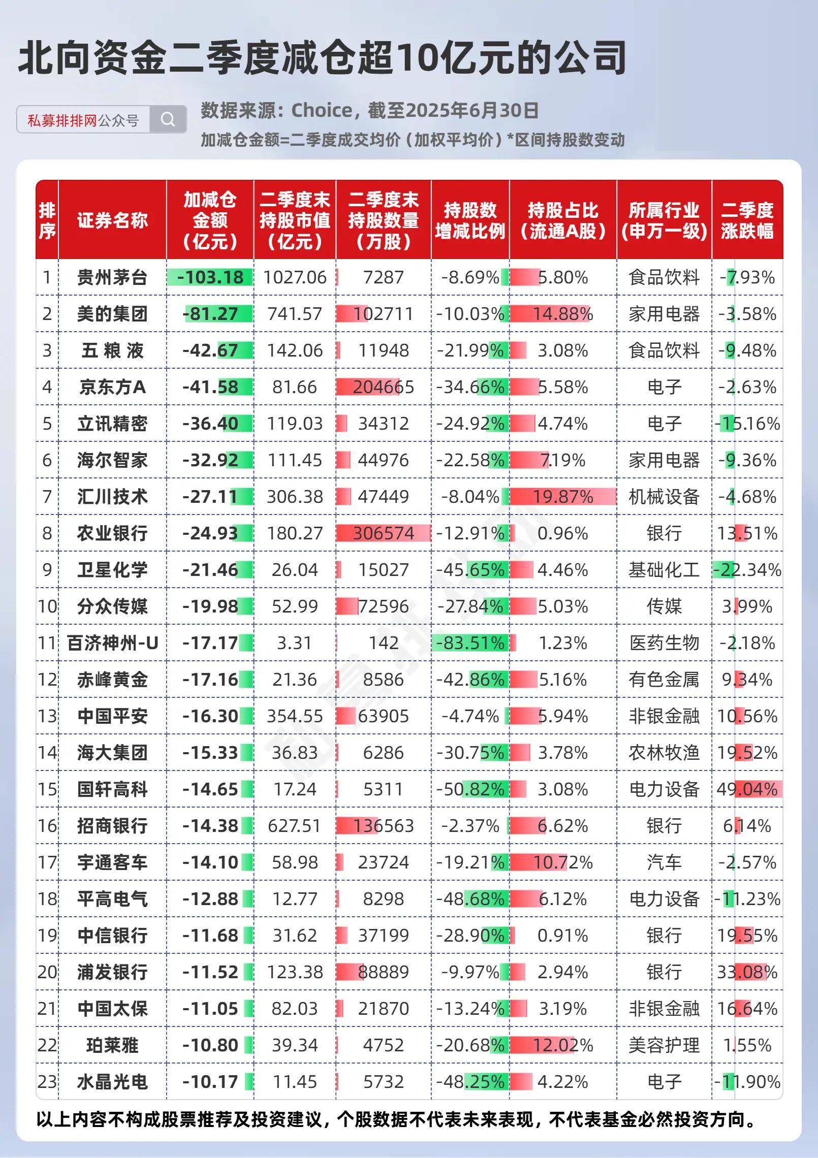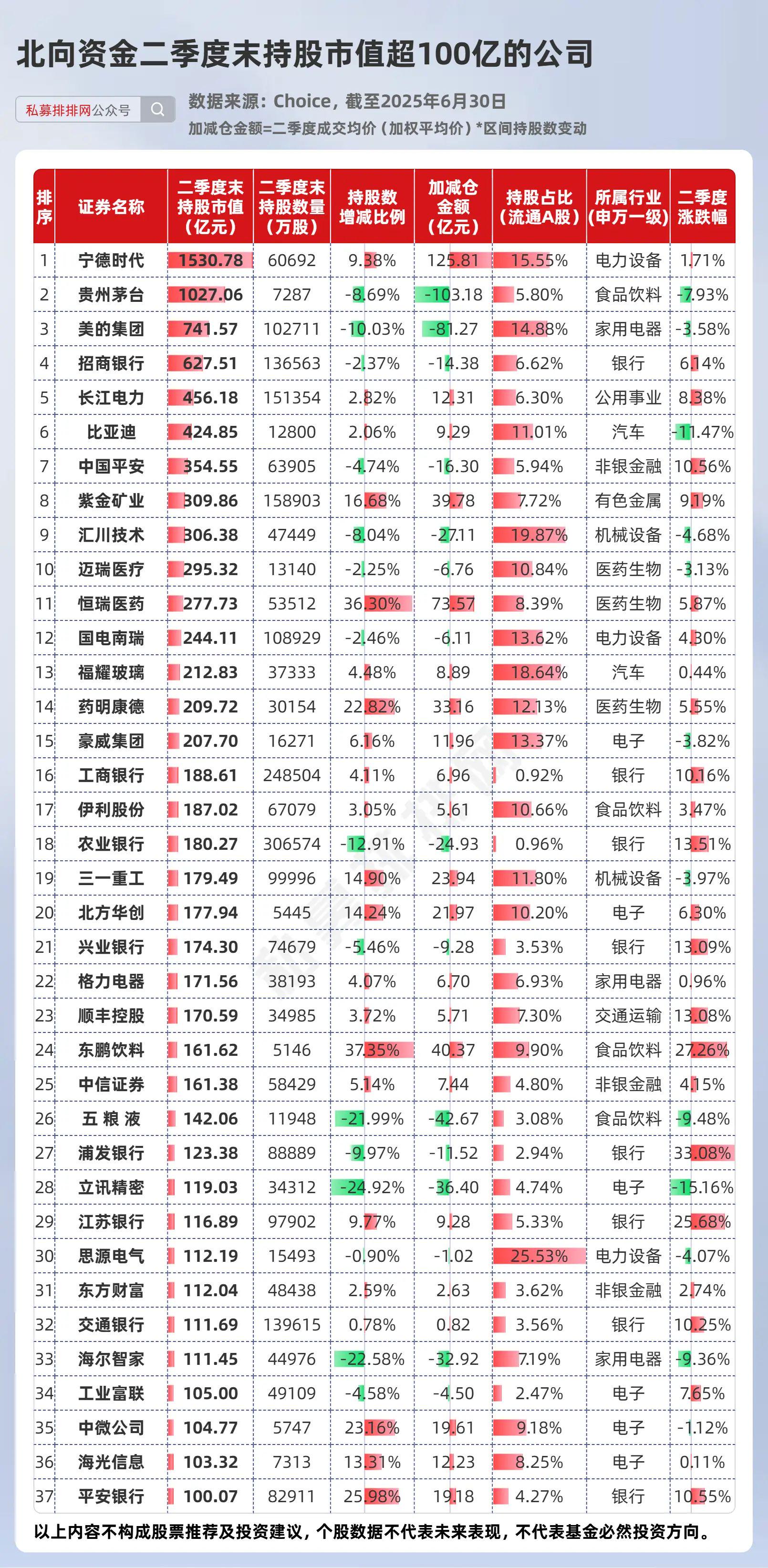 2025年二季度末,北向资金第一大重仓股是宁德时代,持股市值约为1531亿元,北向资金在二季度净买入该股约126亿元。其第二大重仓股为贵州茅台,持股市值约为1027亿元,相比一季度末减少超200亿元,一方面是股价下跌导致,另一方面是北向资金在二季度减仓约103亿元。