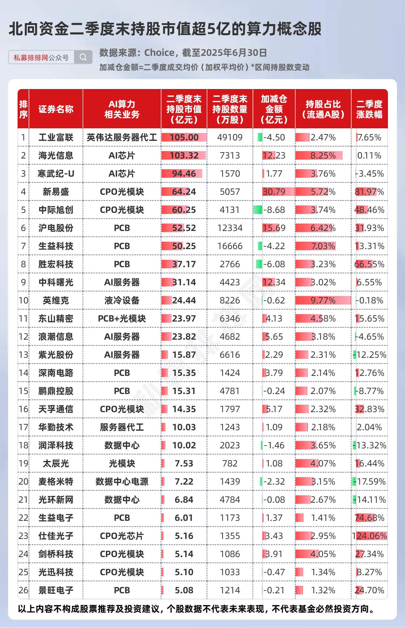 其中,北向资金对工业富联、海光信息的持股市值均超100亿元;二季度加仓金额超10亿元的算力概念股有4只,加仓金额最多的个股是英伟达的光模块供应商新易盛,二季度加仓金额接近31亿元,该股在二季度涨幅接近82%。