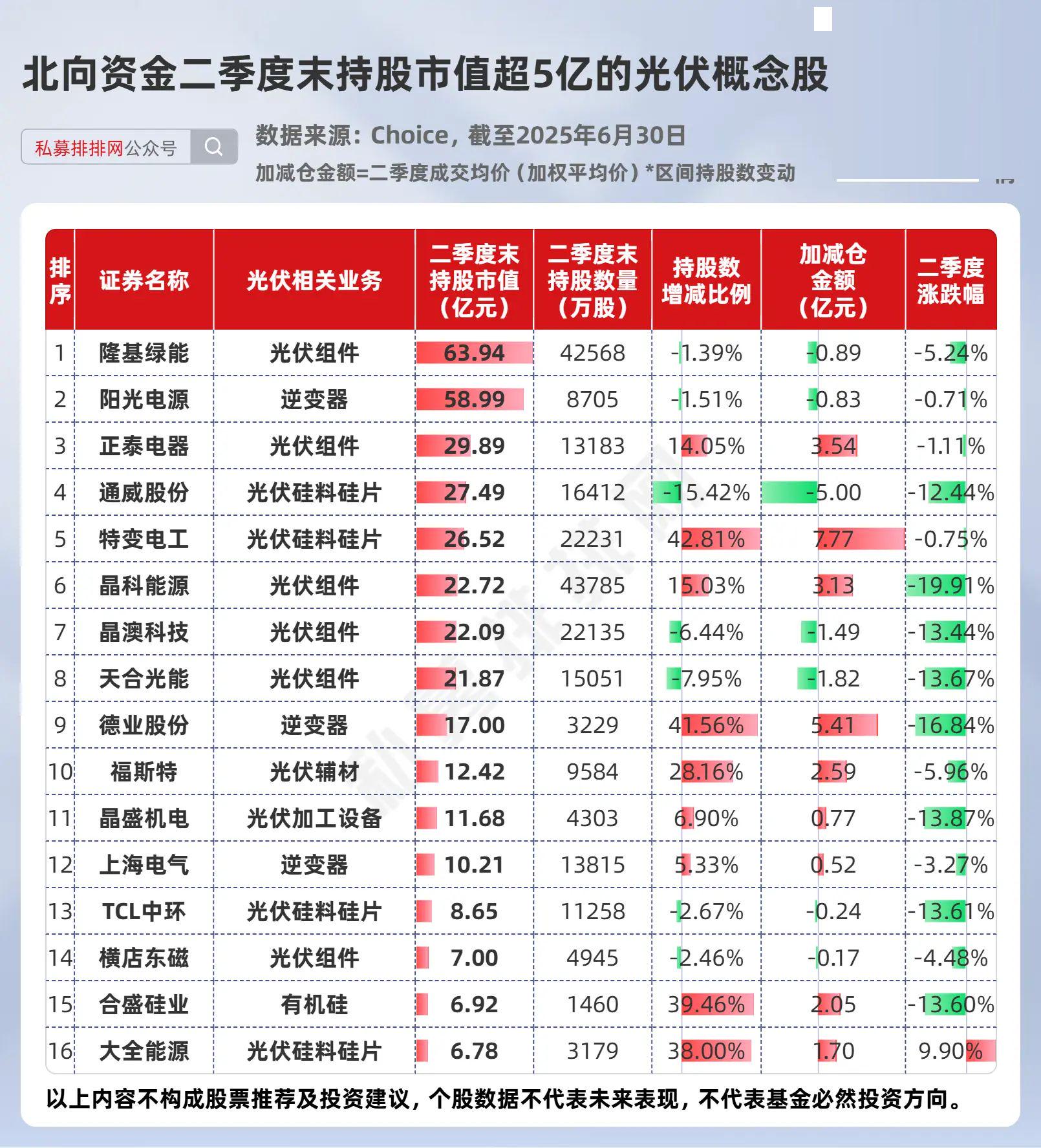 经笔者梳理发现,2025年二季度末,北向资金持股市值超5亿元的光伏概念股有16只,超20亿元的共有8只。其中,北向资金持股市值最多的光伏概念股是隆基绿能,持股市值接近64亿元;其次是阳光电源,持股市值接近59亿元。