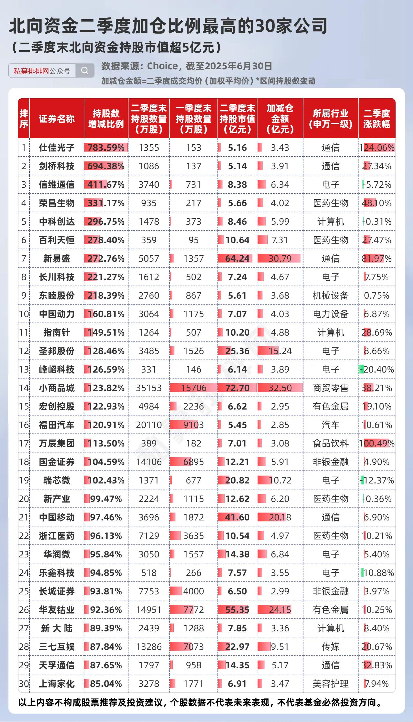 从持股变动比例来看,今年二季度,北向资金大幅加仓多只个股。为了给读者提供更好的参考,笔者在“2025年二季度末北向资金持股市值超5亿元”的公司中梳理出了2025年二季度末持股数相比2025年一季度末增加比例最多的30家公司。今年二季度股价涨幅中位数为8.53%,明显跑赢同期上证指数的涨幅(3.26%)。其中,涨幅超20%的公司占10家。
