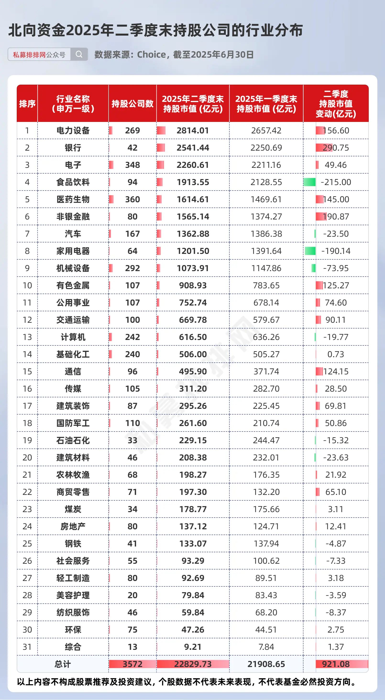 首先,从北向资金持股的行业分布(申万一级行业)来看,2025年二季度末,北向资金持股市值最多的3个行业依次是:电力设备(2814亿元)、银行(2541亿元)、电子(2261亿元)。此外,对食品饮料、医药生物、非银金融、汽车、家用电器、机械设备等6个行业的持股市值均超1000亿元。