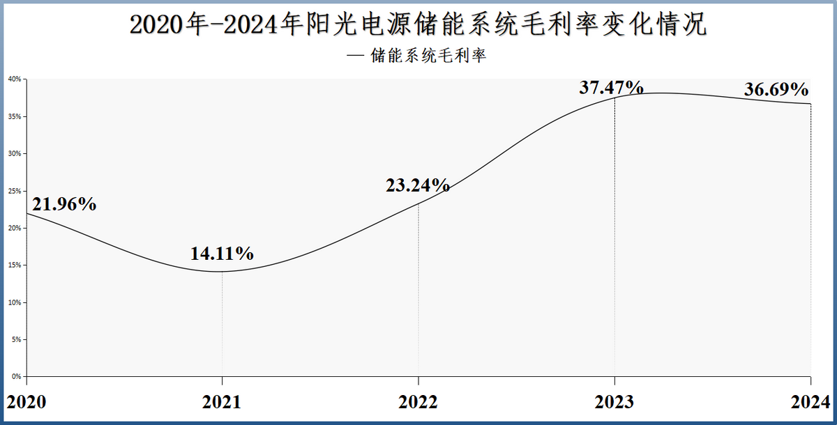 2020-2024年,公司储能系统毛利率从21.96%稳步上升到36.69%,并且其营收占总营收的比重也从2020年的6.06% 提升到2024年的32.06%,从而带动了公司整体毛利率提升。
