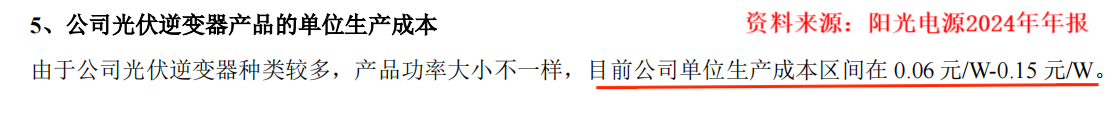 而规模效应之下,截至2024年底,阳光电源光伏逆变器的单位生产成本区间在0.06元/W-0.15元/W。
