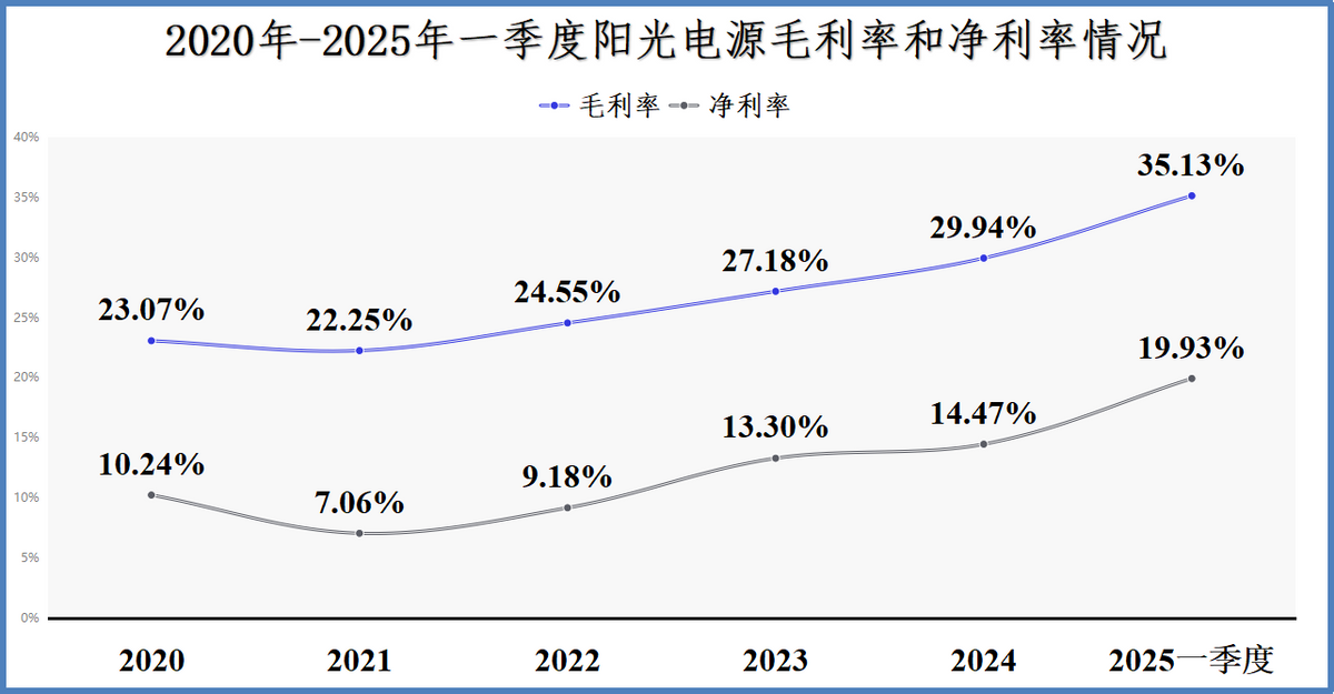 2020-2024年,阳光电源毛利率从的23.07%持续增长到29.94%,连带着净利率也从10.24%同步增长到14.47%。