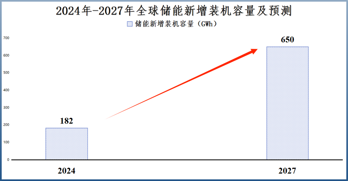 据估计,2024年全球储能装机容量大约182GWh,同比增长72%,预计到2027年将达650 GWh,2024-2027年全球储能新增装机年复合增速有望超过50%。