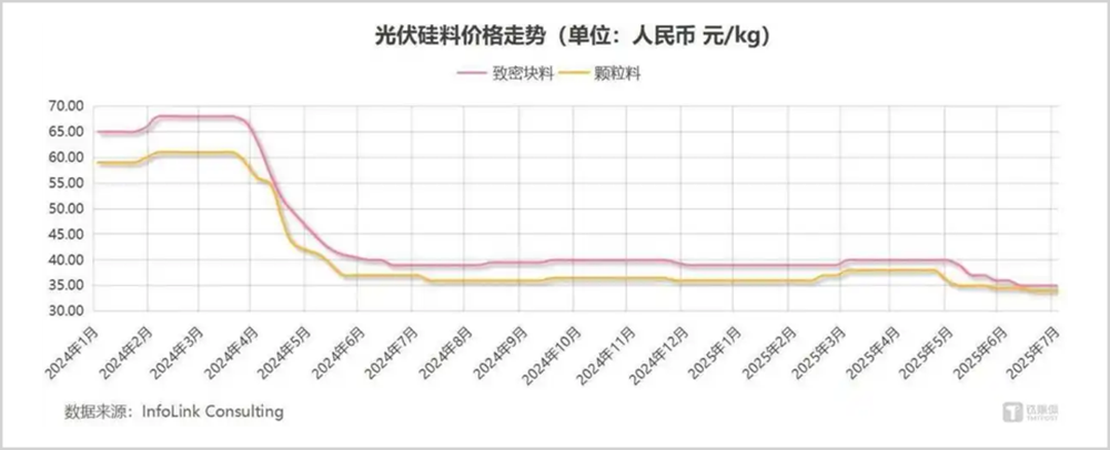 InfoLink数据显示,截至7月2日,致密料均价35元/kg,较去年末继续跌超10%,相较去年初水平已下降46.2%。中下游硅片、电池片、组件环节无一幸免。