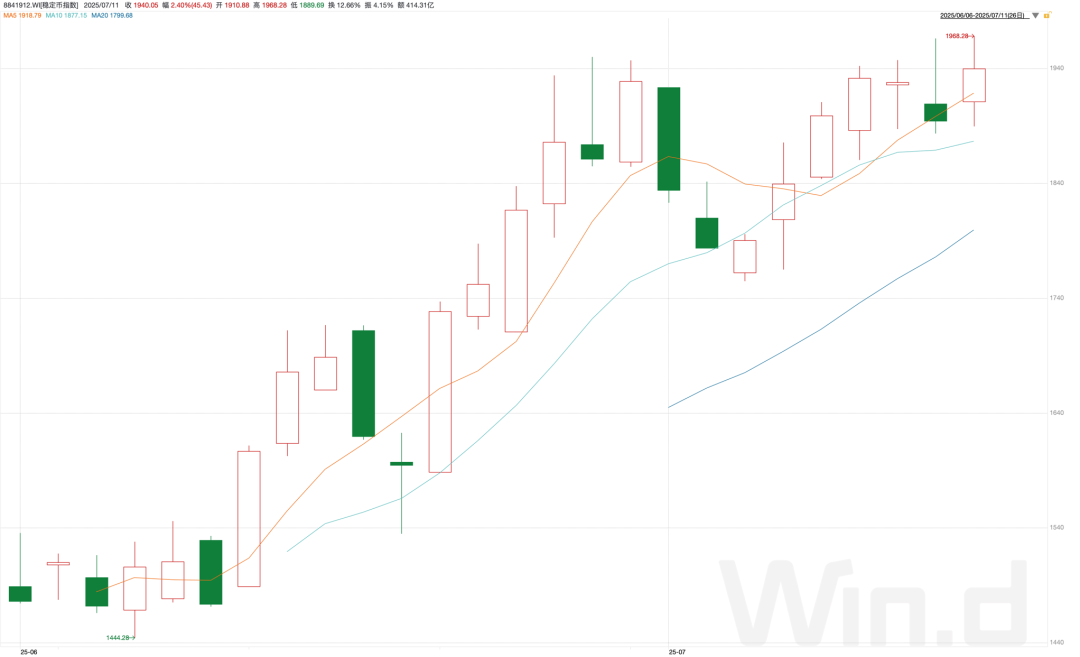 近期,A股市场中稳定币概念表现火爆,wind稳定币指数自6月3日发布至今(截至7月11日),期间指数最大涨幅超过40%,可以说稳定币是近期A股最热门的话题之一。