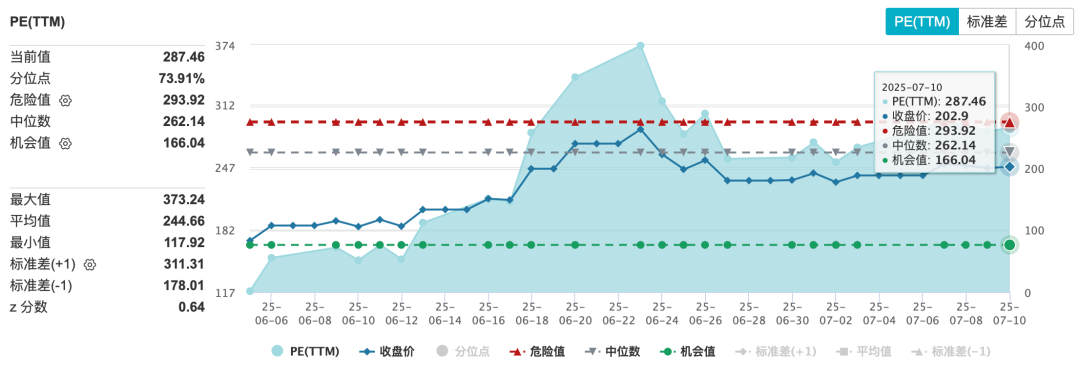 与此同时,随着稳定币发行人Circle于6月初在纽交所上市,在美股也迅速引发了一轮稳定币热潮。Circle的此次IPO不仅获得了超过25倍的超额认购,在投资者的热捧下,股价与估值齐飞,6月5日至今的涨幅超过190%,期间振幅则高达758%,估值最高时的PE-TTM接近400x,行情之火爆远超市场预期。