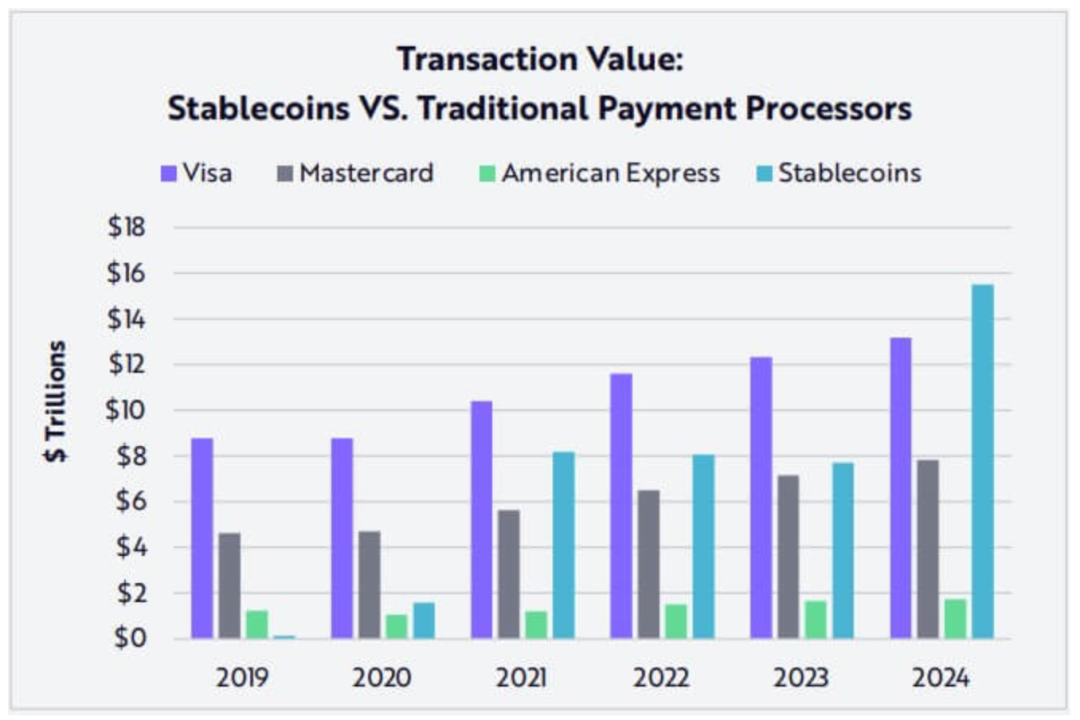 关于稳定币市场的现状,公开资料显示,全球稳定币的总市值已经超过2500亿美元(截至6月10日),用户数量和交易规模在近年来双双保持快速增长。在交易额维度,稳定币的表现更为耀眼,ARK invest的报告显示,在2024年,全球内稳定币的总交易额高达15.6万亿美元,已经超过了同期Visa和Mastercard交易额;德银的统计数据则显示稳定币在2024年的交易额高达27.6万亿美元,比Visa和Mastercard加起来还要多,无论是哪个口径,稳定币近年来交易额的增速都远高于传统支付渠道。